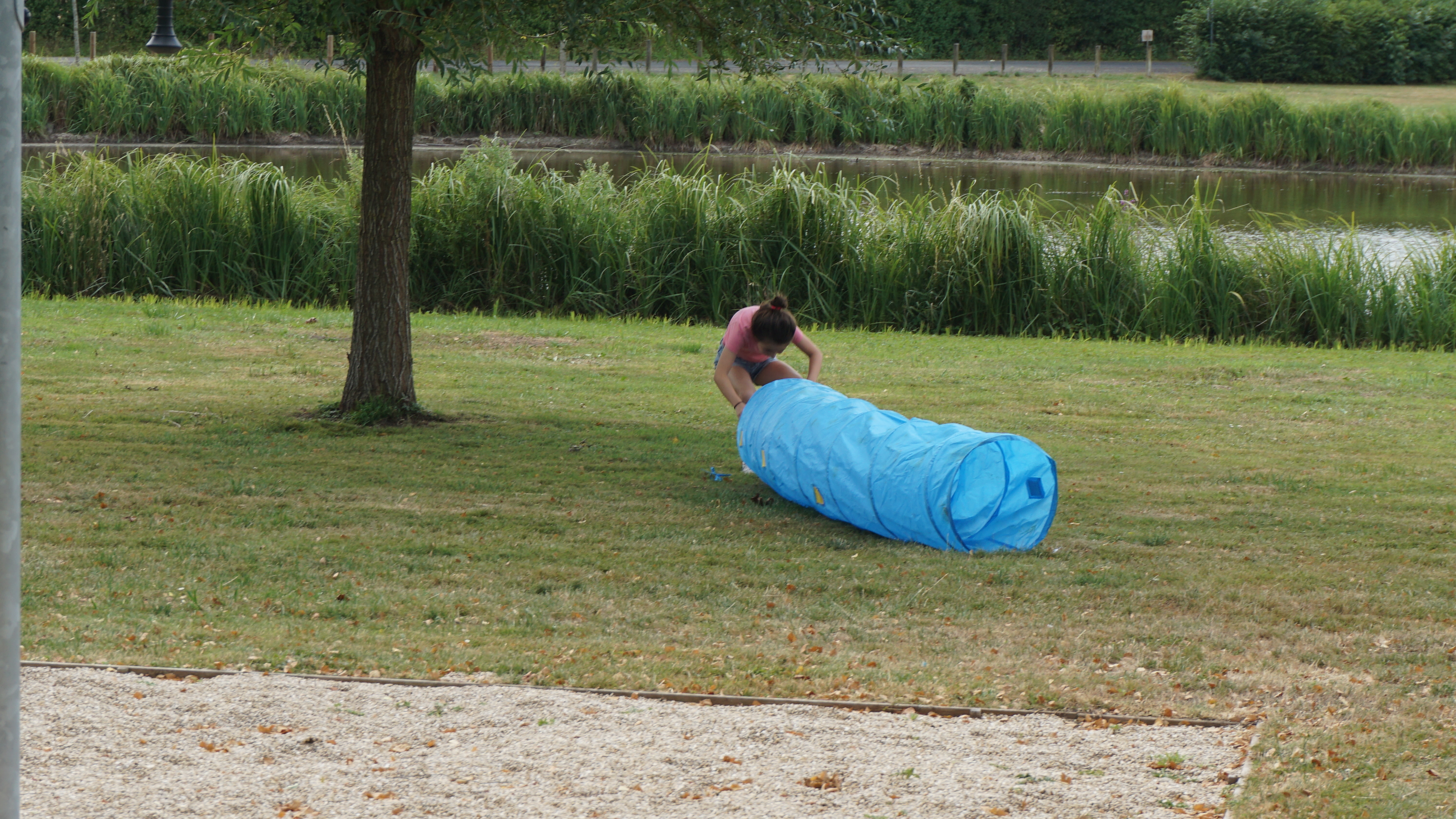 14 juillet, TRÈS CHAUD, mais au bord de l'étang de l'air, et même un peu trop de vent par moment, qui a fait s'envoler les ballons… Vers 15h nous installons les jeux : structure gonflable, ballons, corde, sacs, pêche à la ligne, colin-maillard pour les dames… Vers 16h les premiers enfants se précipitent sur la structure, nous passerons un bon après-midi, à jouer, regarder et applaudir les enfants et prendre un goûter ensemble au frais sous l'œil vigilant DE LA FAMILLE « CYGNE ».